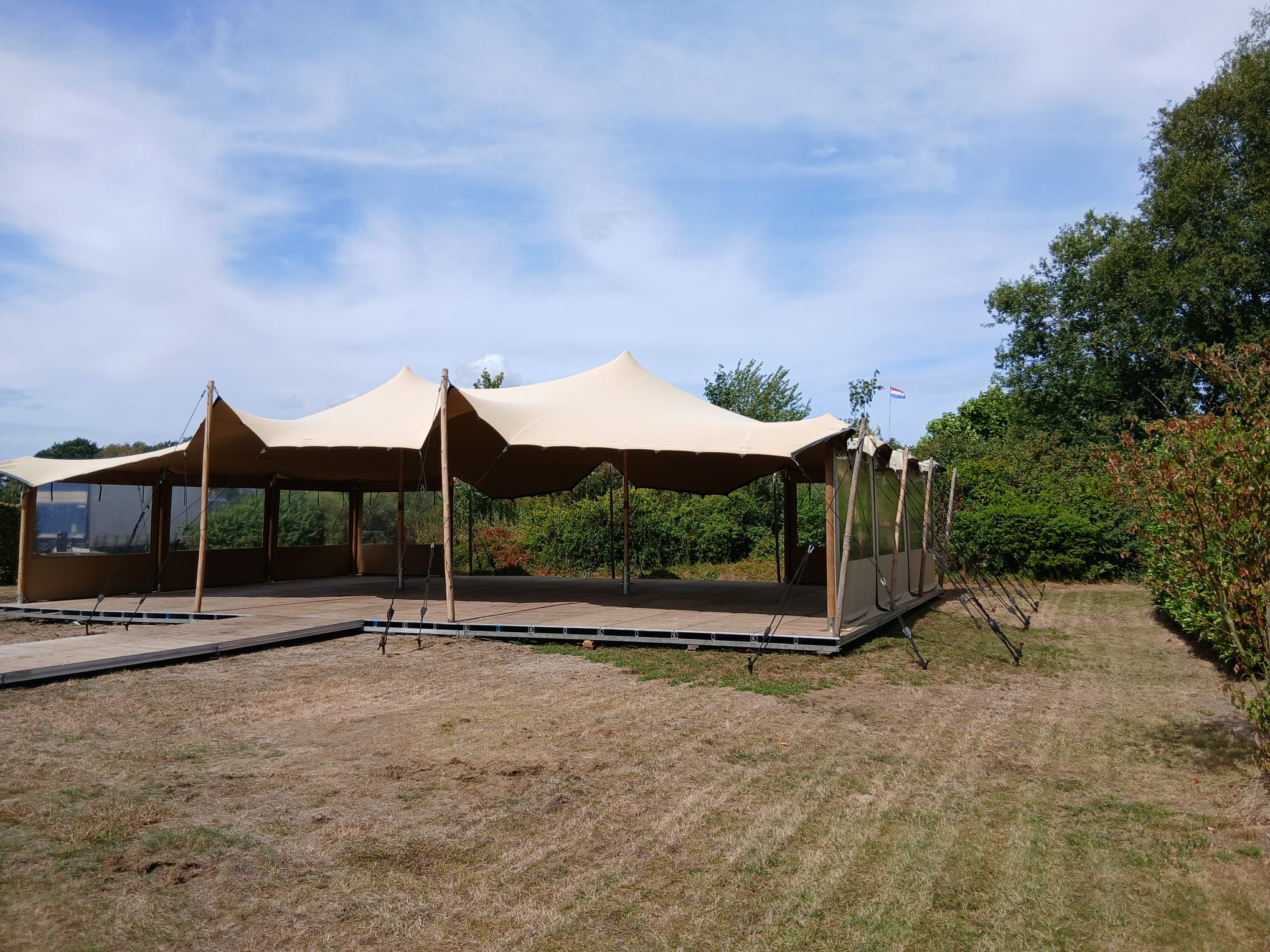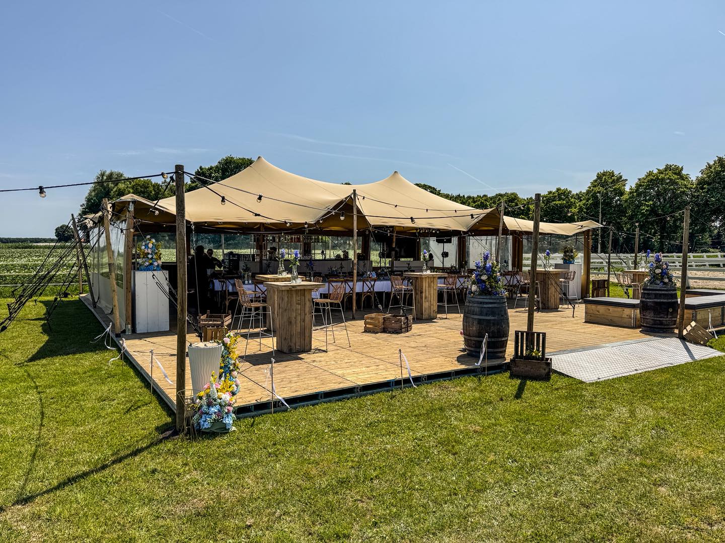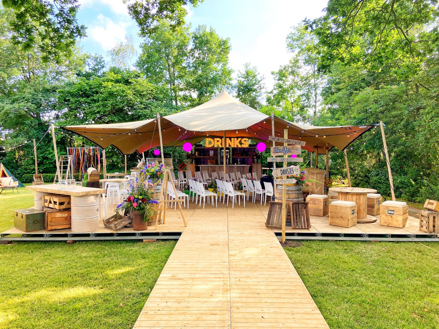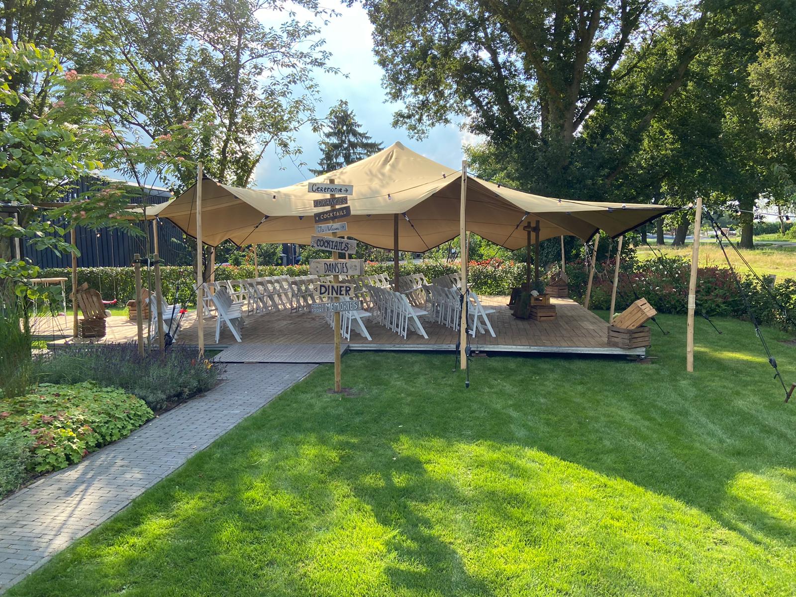De stretch tent is een veelzijdige, stijlvolle overkapping met een flexibel doek dat zich moeiteloos aanpast aan vrijwel elke locatie. Dankzij de organische vormen creëert deze tent direct sfeer, of het nu gaat om een bruiloft, festival, tuinfeest of bedrijfsevenement.