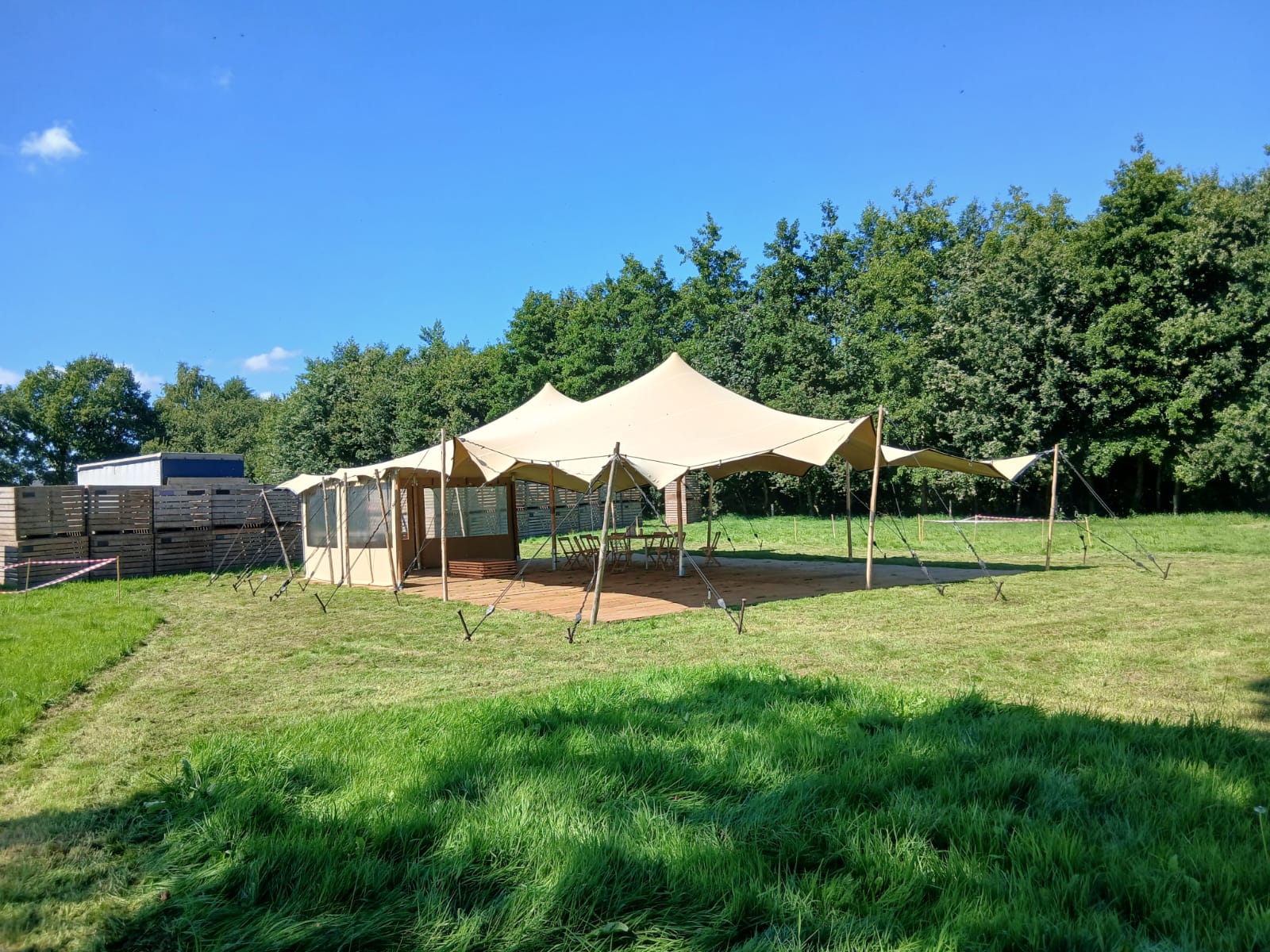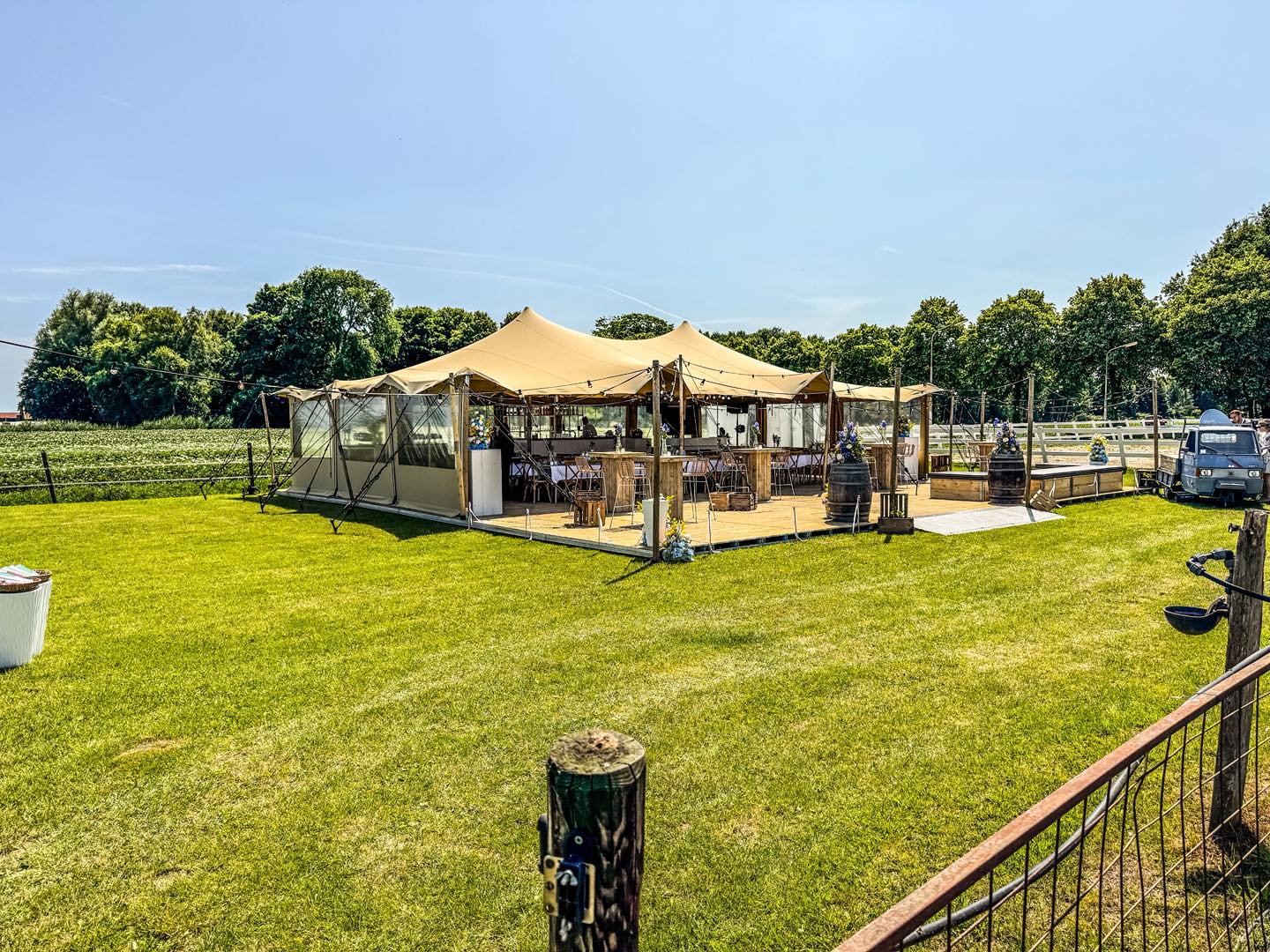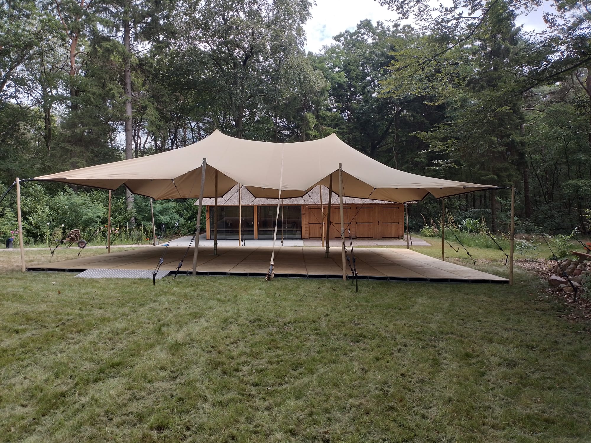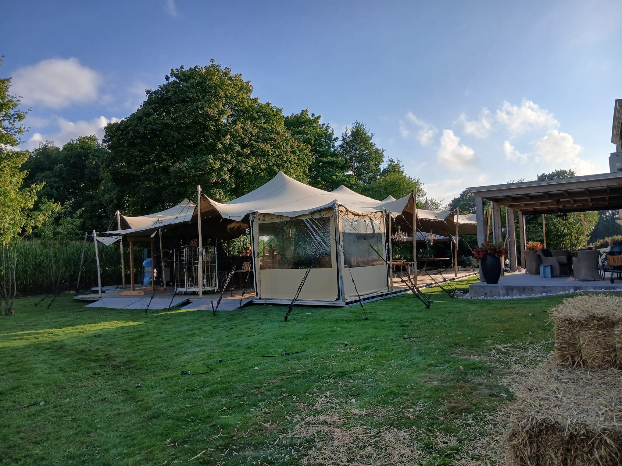 De stretch tent is een veelzijdige, stijlvolle overkapping met een flexibel doek dat zich moeiteloos aanpast aan vrijwel elke locatie. Dankzij de organische vormen creëert deze tent direct sfeer, of het nu gaat om een bruiloft, festival, tuinfeest of bedrijfsevenement.